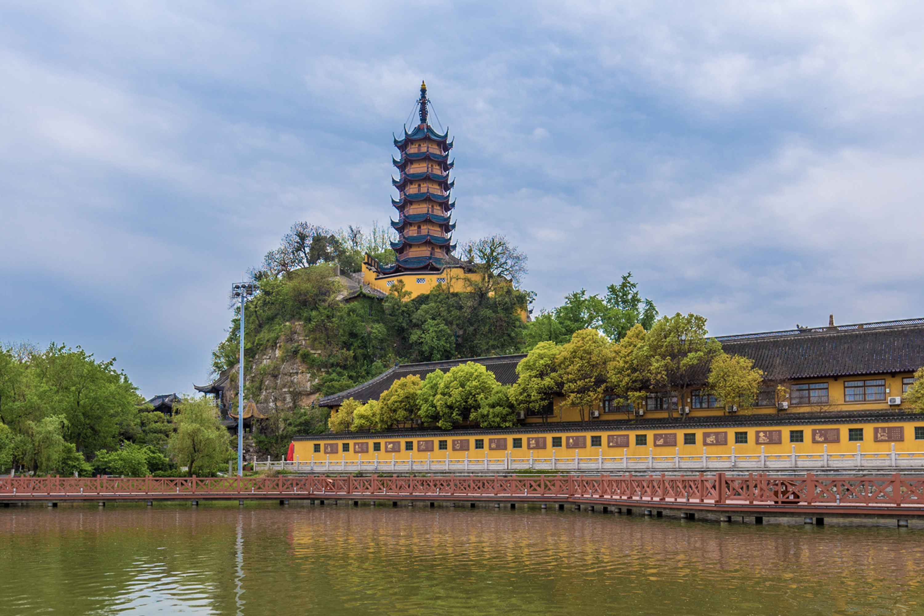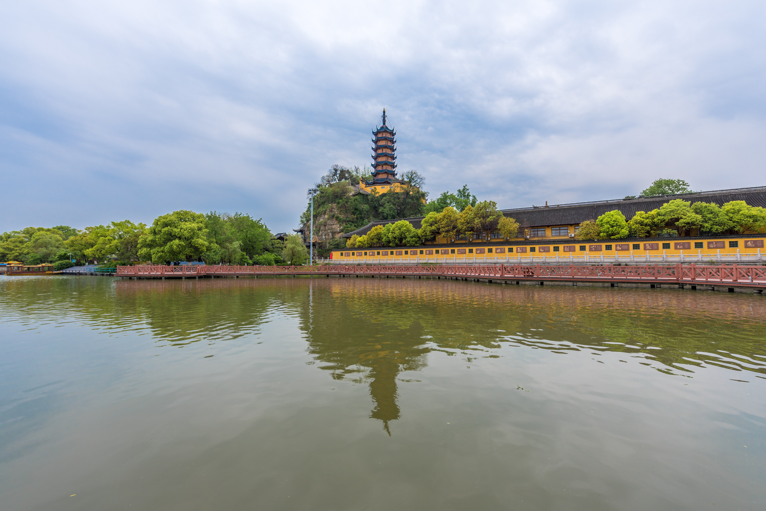 金山湖金山湖,是镇江知名的湖泊,风景如画,欣赏湖光潋滟的美景,亭台楼阁,木桥和花草树木错落其中,盛夏时节还可以看到荷叶满湖,荷花摇曳其中,宛如一幅秀丽的山水画卷。还可以看到巍峨当地慈寿塔倒映在如镜子般平坦的湖面上,令人心旷神怡。